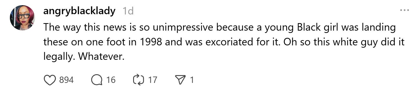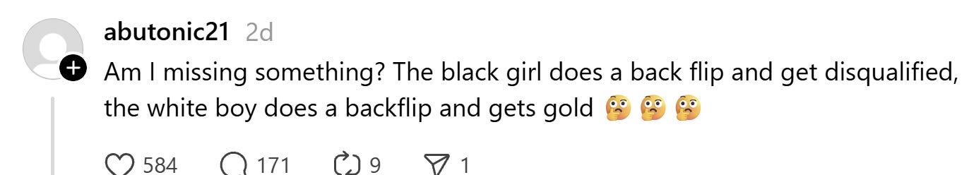 A black, female French skater was “punished,” “singled out,” or “persecuted” for daring to do a backflip at the Olympics while an American white, male skater is now being celebrated for the same move.